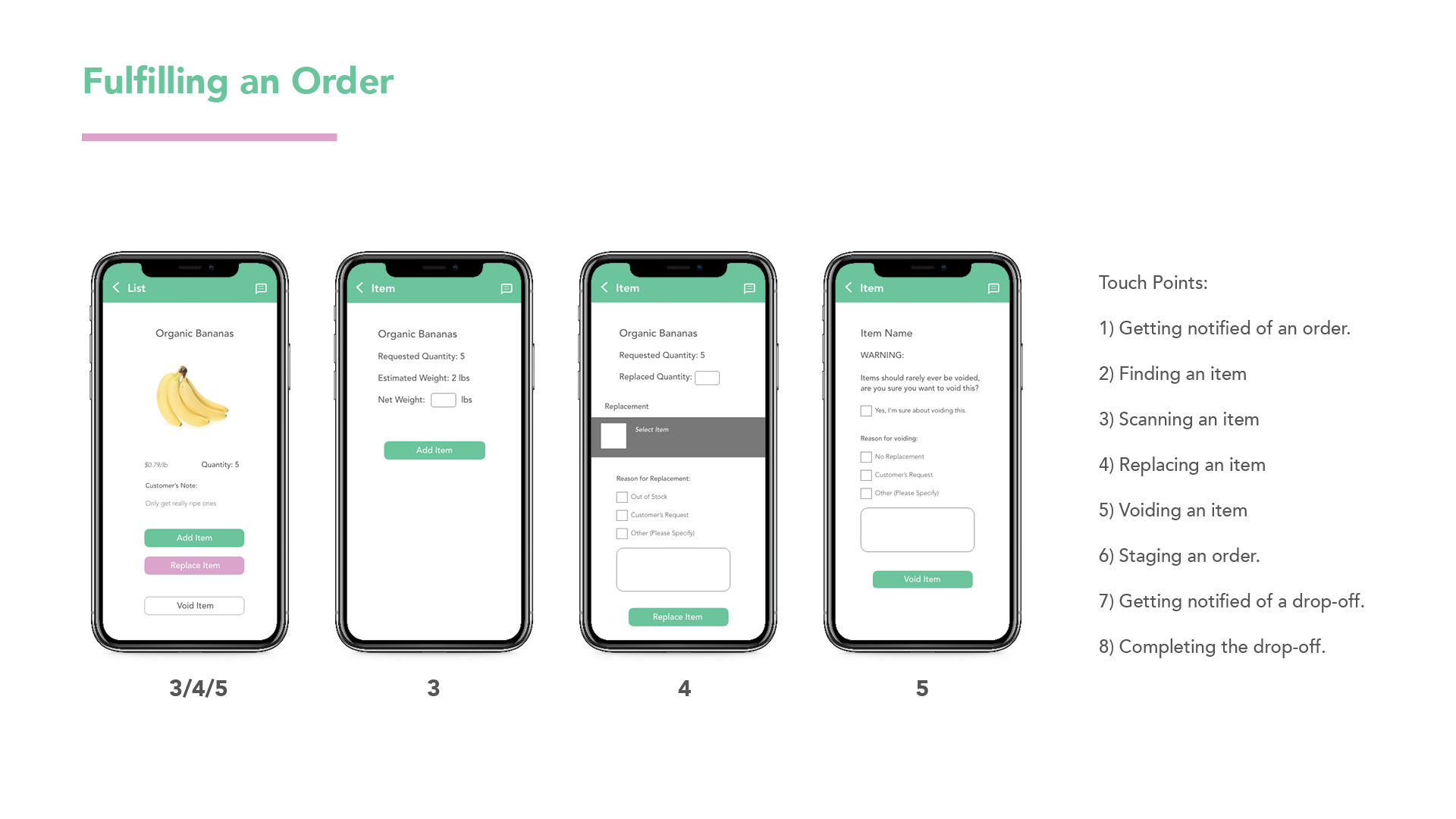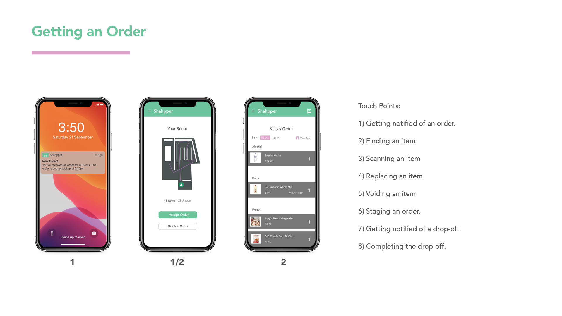 I was able to use the knowledge and experience from my time as a shopper to research for my design. While at Whole Foods, I also met former shoppers of other grocery stores who told me about their experiences at the other stores. The goal of Shahpper is to make work easier for the in-store shopper thus letting them focus more on their performance. This will in turn create a chain reaction of positive results such as faster turn-around times for customers to pick-up their order from the store and it will also result in higher customer satisfaction as the customers will be able to effectively work with the shopper to ensure that the customer’s experience lives up to their expectations.